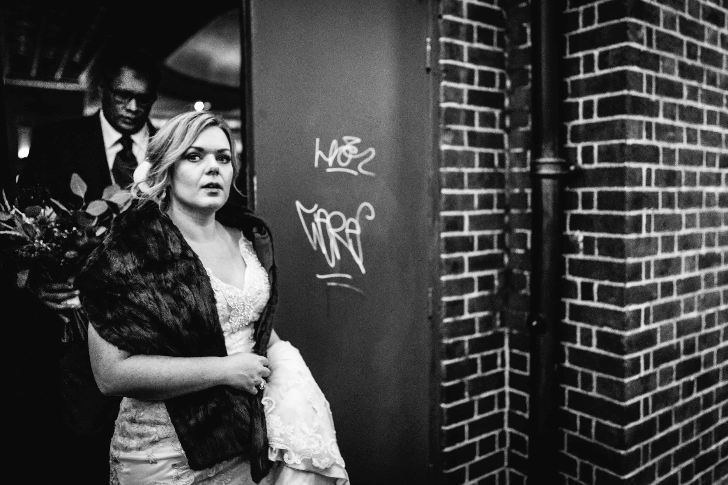 A woman in a wedding dress and fur stole stands near a brick wall, with a man in a suit behind her holding a bouquet of flowers, in an urban setting.
