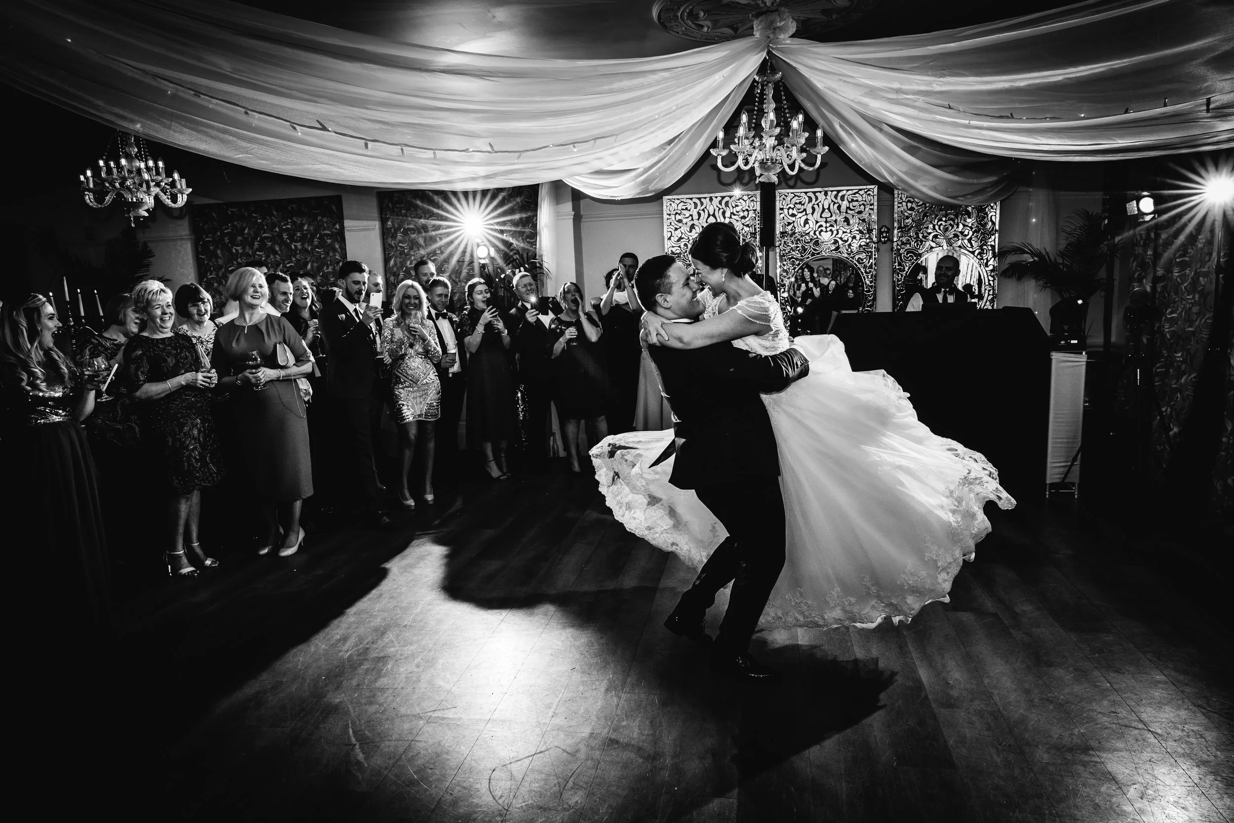 Black and white photo of a wedding reception, showing a groom lifting a bride during their first dance, with guests watching and taking photos in a decorated ballroom with chandeliers and draped ceiling.