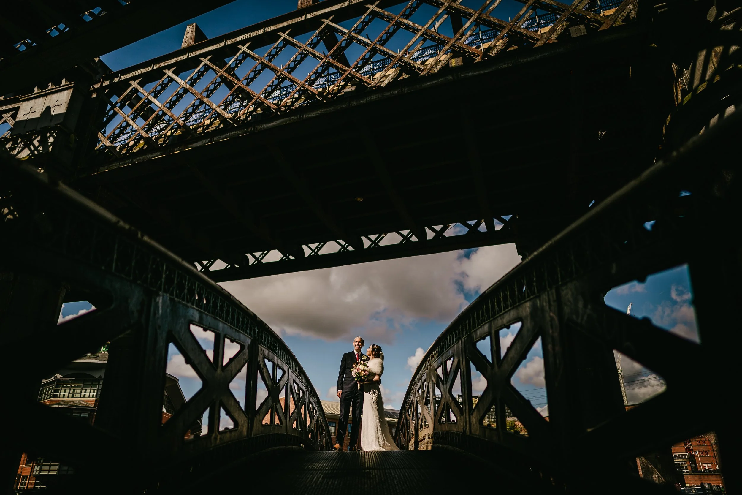 A bride and groom standing on a small bridge beneath a large steel bridge structure on a partly cloudy day.