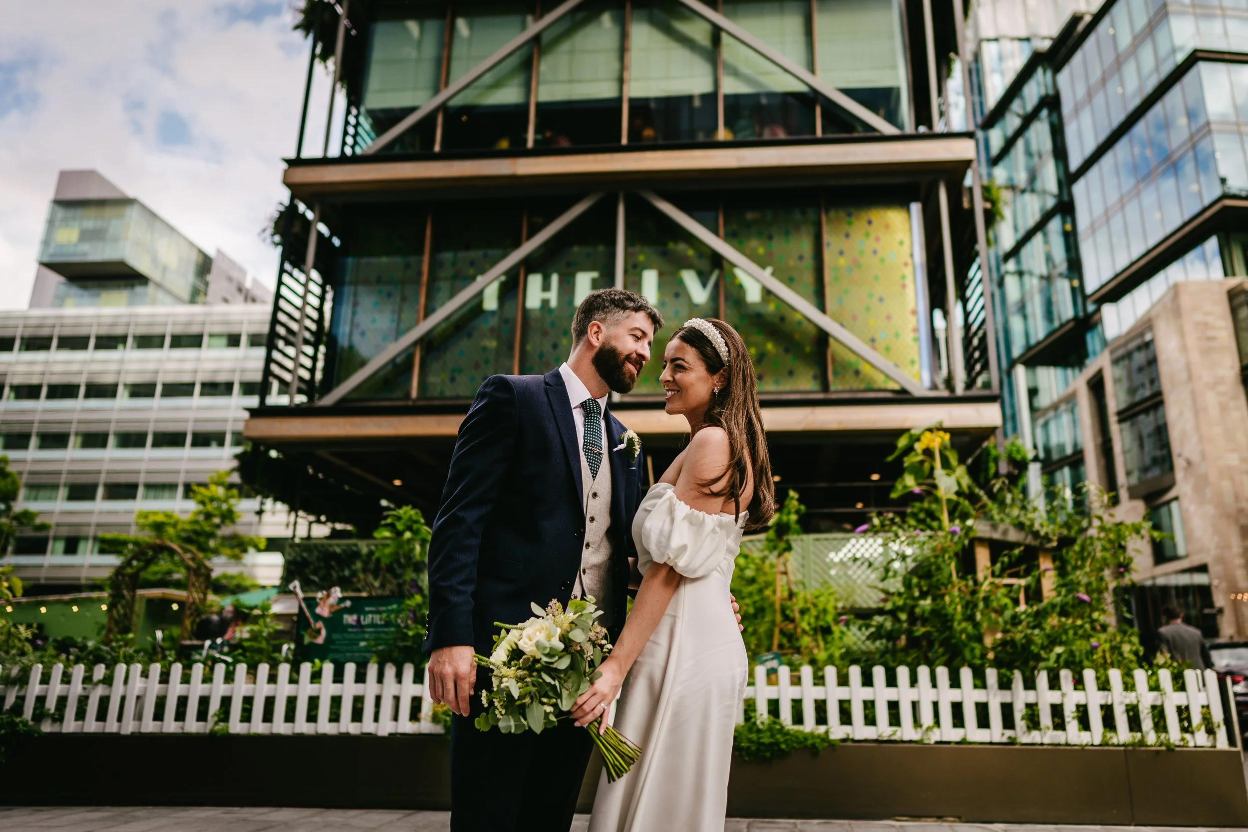 A bride and groom sitting on a wooden bench outside a pub called The Vine, with green tiled exterior. The bride is wearing a white wedding dress and holding a bouquet, and the groom is in a dark suit with a teal tie. They are looking at each other an