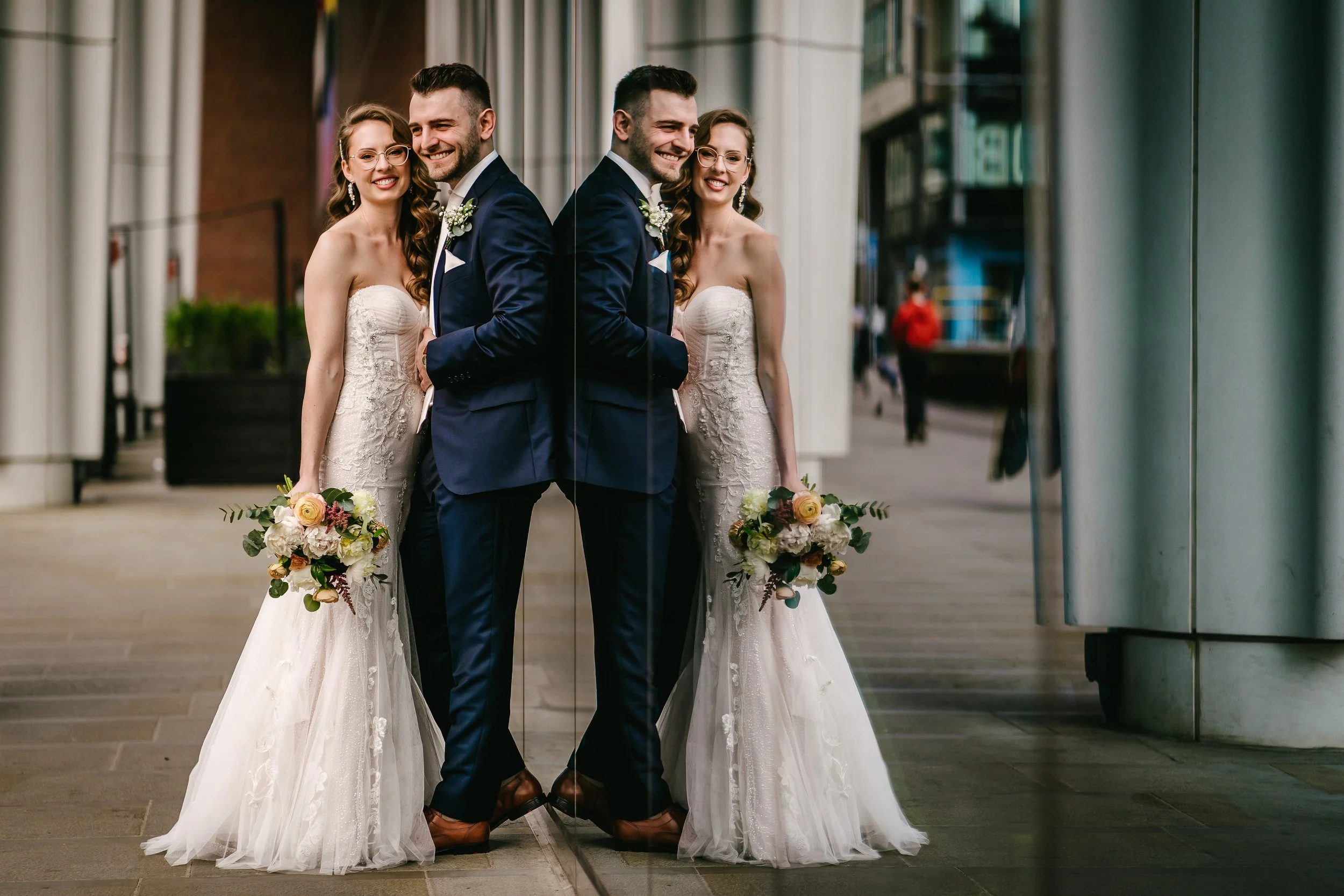 A newlywed couple stands on a city sidewalk, reflected in a large mirror. The bride wears a strapless white lace wedding gown and holds a bouquet of flowers, and the groom wears a navy blue suit with a boutonniere. Both are smiling and looking at the