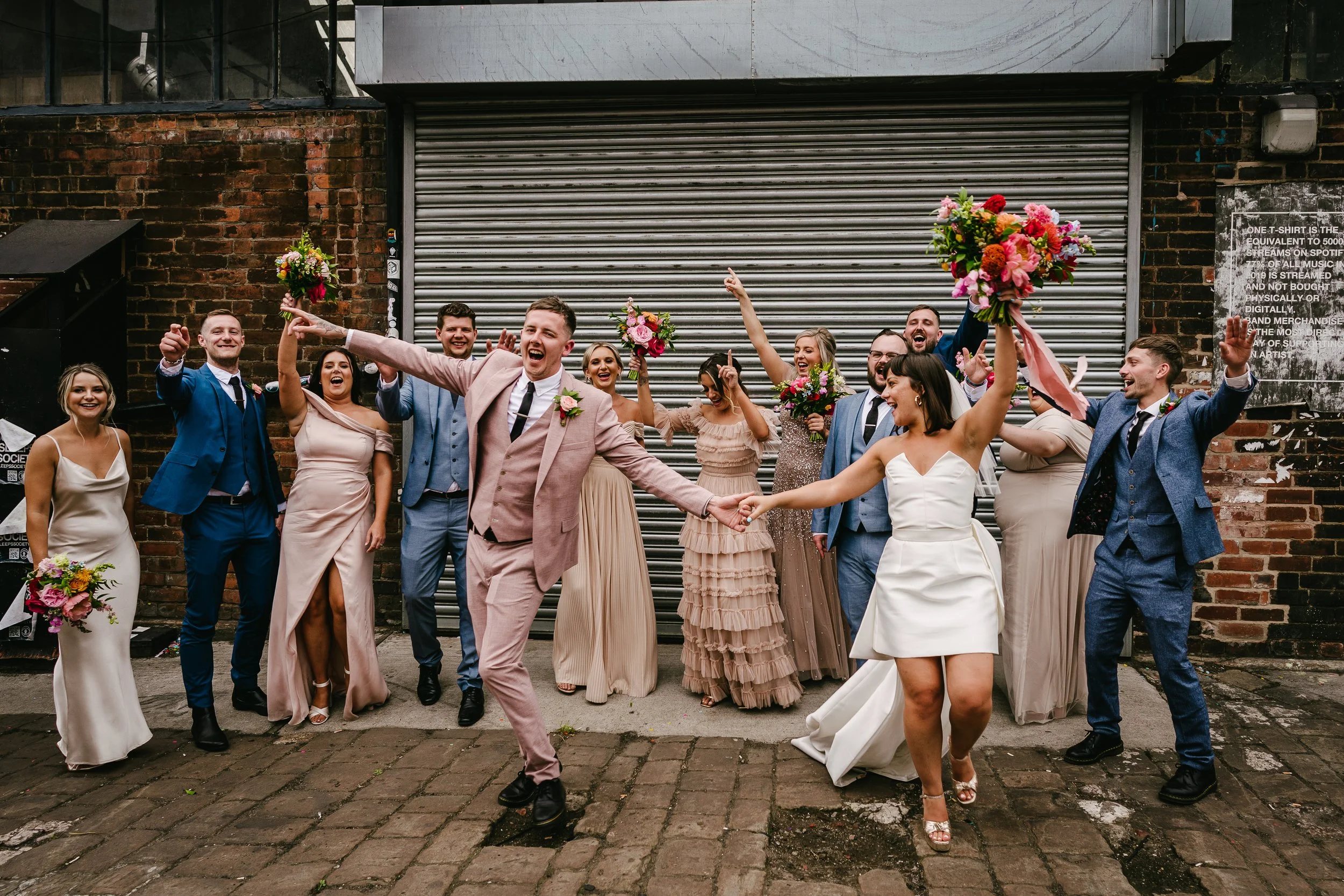 A group of wedding celebration guests, including the bride and groom, in front of a brick wall with a metal garage door, celebrating with joyful expressions, holding bouquets, and dancing.
