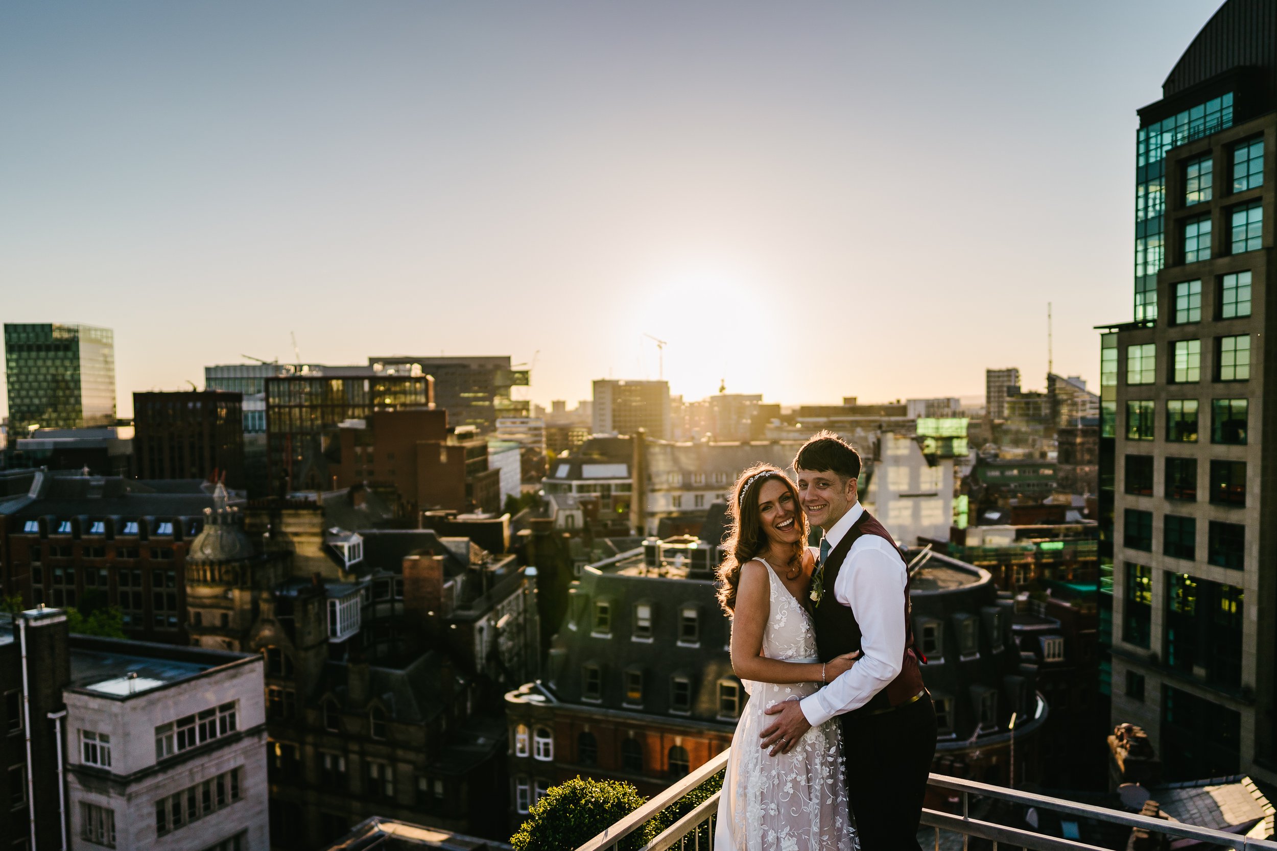 A happy couple in wedding attire posing on a rooftop balcony with a city skyline at sunset in the background.