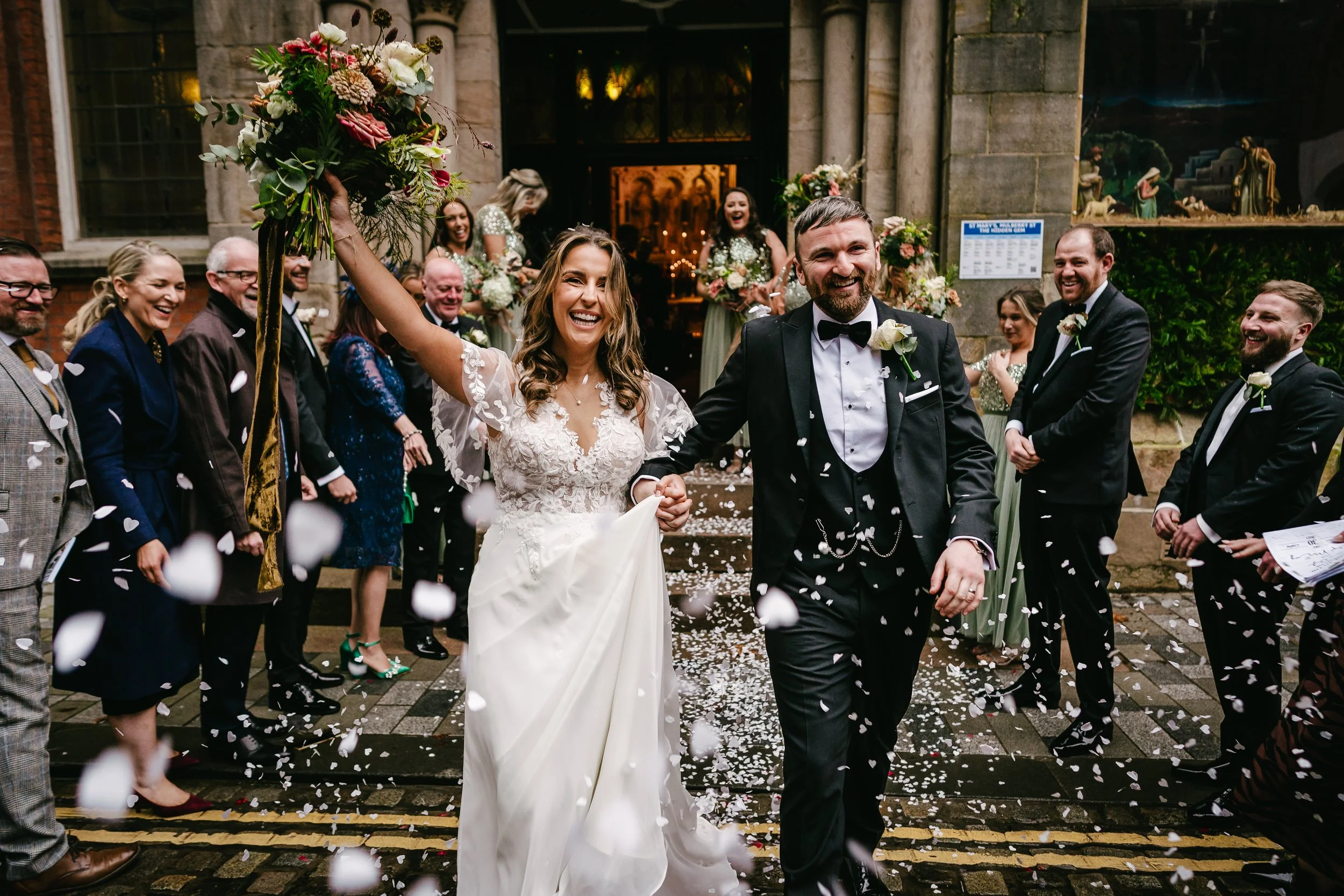 A happy bride and groom leaving a church, surrounded by smiling guests, as confetti falls around them.
