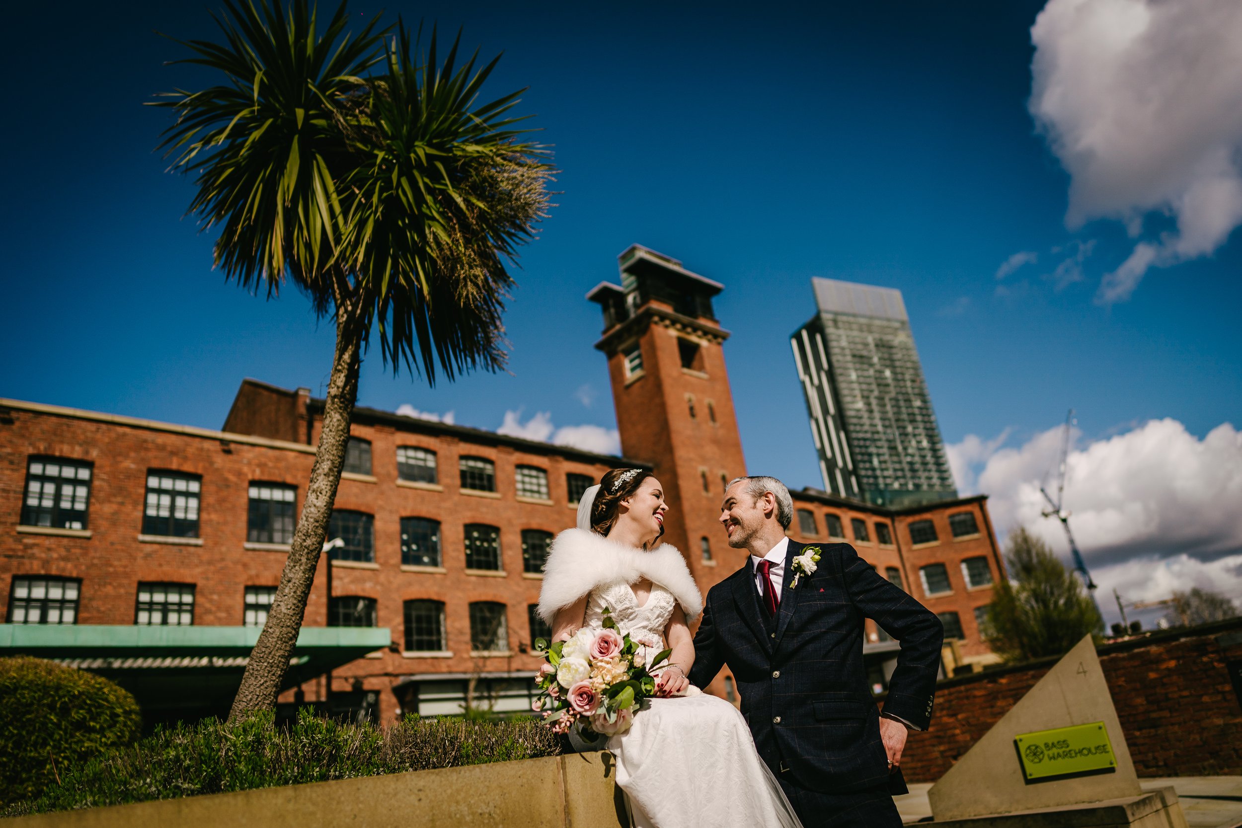 A bride and groom smiling at each other outdoors near a brick building with a tall tower and city skyscrapers in the background, on a sunny day with blue sky and some clouds.
