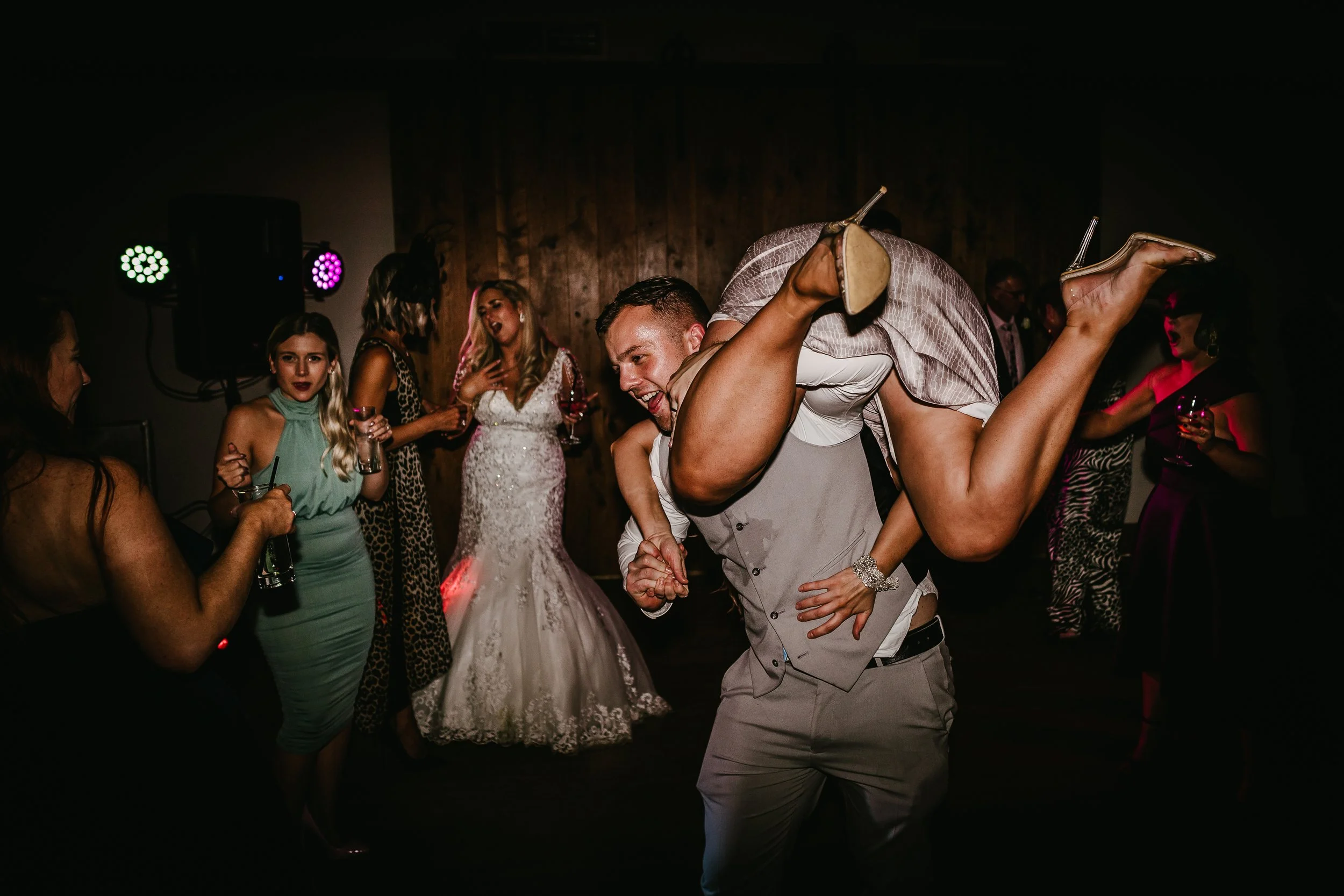 A man in a gray vest and pants dancing with a woman in a silver dress at a wedding reception with guests dancing and celebrating in the background.