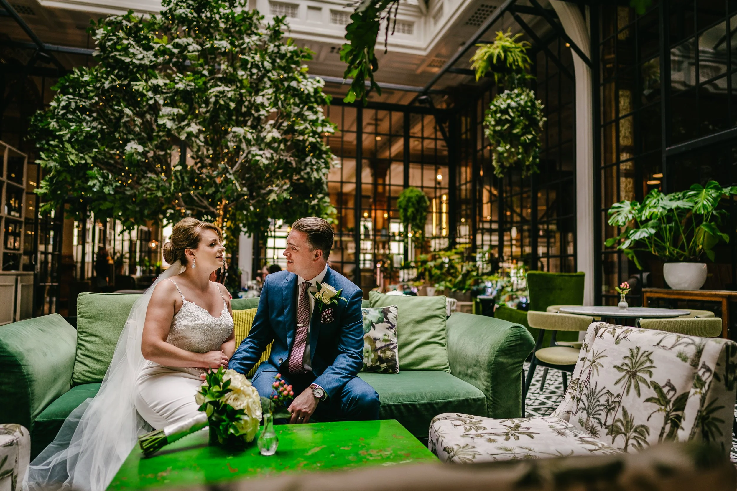 A newlywed couple sits together on a green sofa in a lush, indoor botanical setting. The bride wears a white lace wedding dress, and the groom wears a dark blue suit with a white shirt, a patterned tie, and a boutonniere. They are looking at each oth